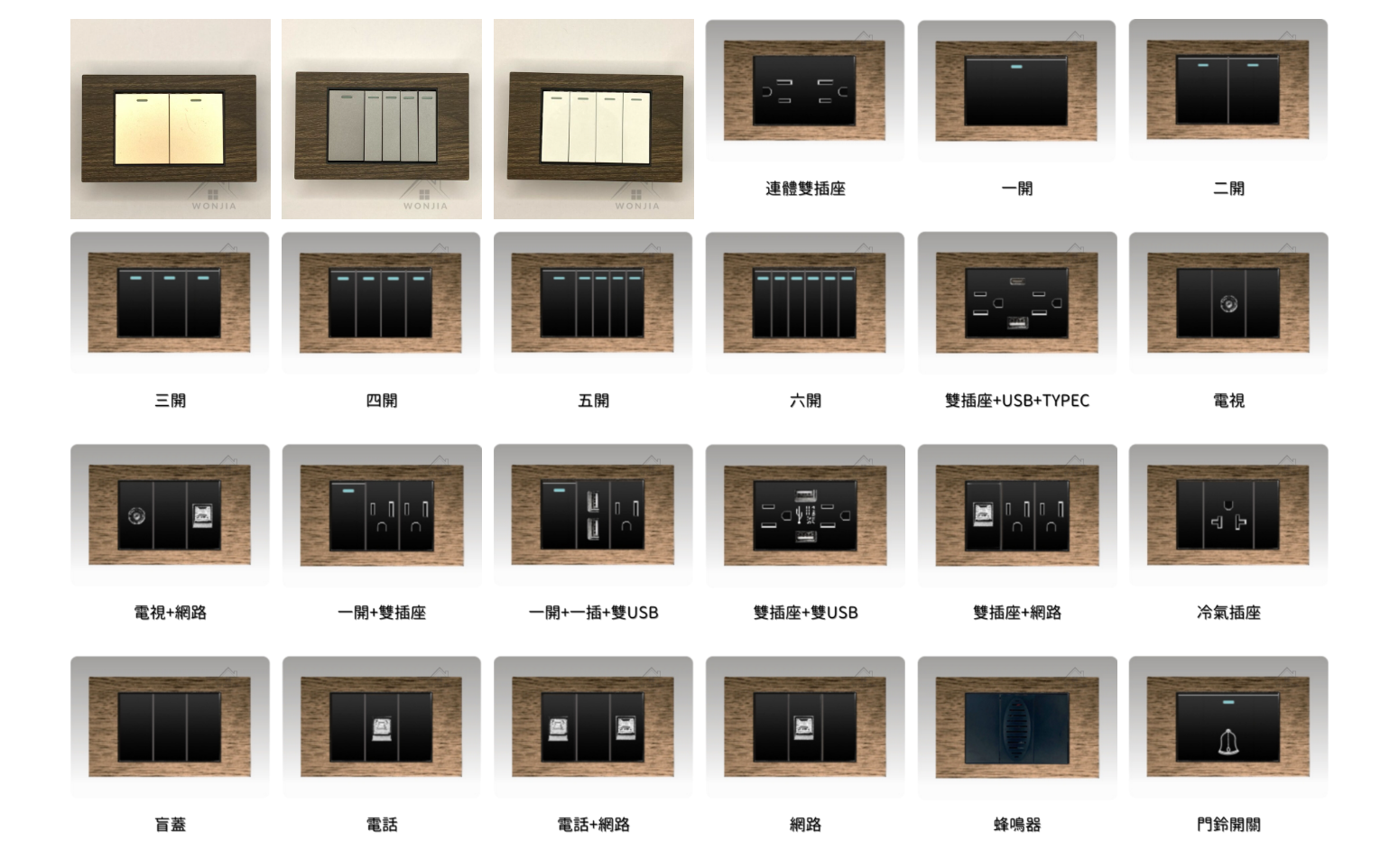 直插式:連體雙插座 | 組合雙插座 | 一開 | 二開 | 三開 | 一開+雙插座 | 一開+一插+雙SUB | 電視 | 電視+網路 | 電話 | 電話+網路 | 網路 | 雙插座+網路 | 盲蓋 | 門鈴開關 | 門鈴蜂鳴器